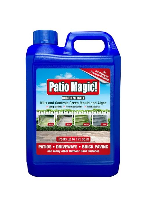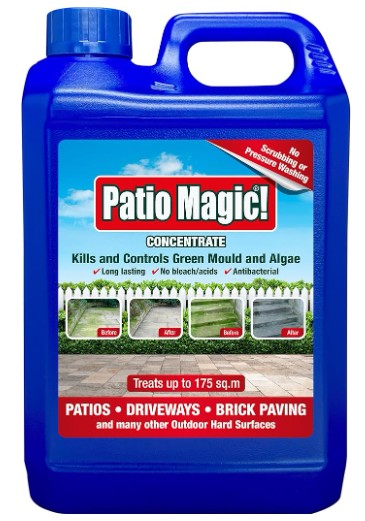 - Patio Magic kills and controls green mould moss algae on all outdoor hard surfaces.