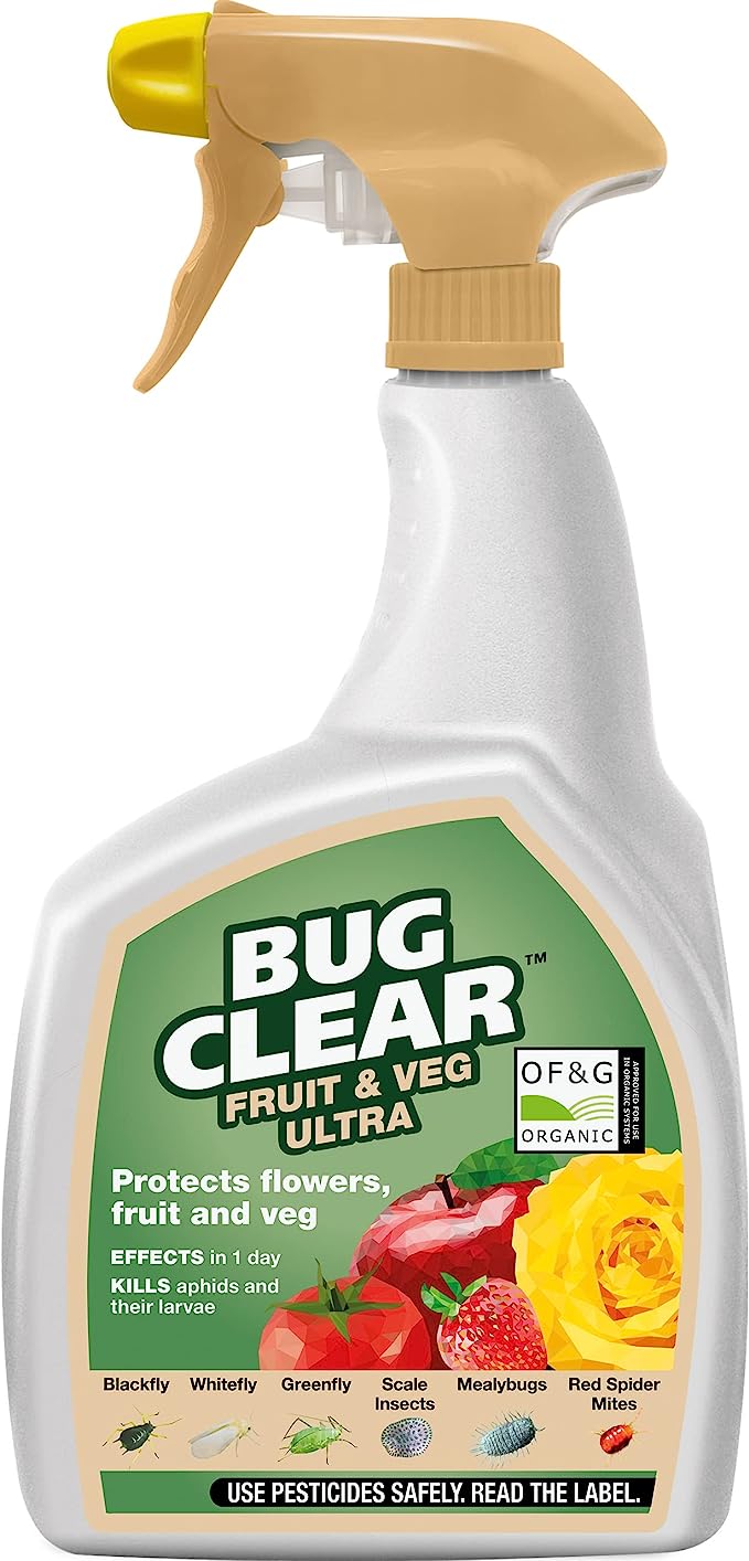 BugClear™ Fruit & Veg Ultra ready to use spray controls aphids, scale insects, mealy bugs, red spider mites and other mites. It is ideal for fruit, vegetables and ornamentals, and can be used in organic gardening. Effects seen in just 1 day. Based on rapeseed oil, the product is fully certified for use in organic gardening. Bottle is made from 100% recycled material and can be recycled.