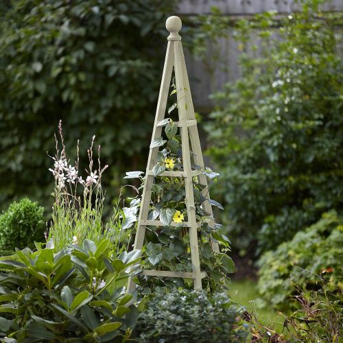1.9m high when assembled. Classic, sturdy pine wood obelisk. Ideal for borders, flower beds and patio planters. Assembled in minutes- full assembly instructions included.