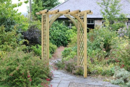 Pergola-style roof – Adds a touch of elegance to this pretty garden archway and gives climbing plants more room to grow
