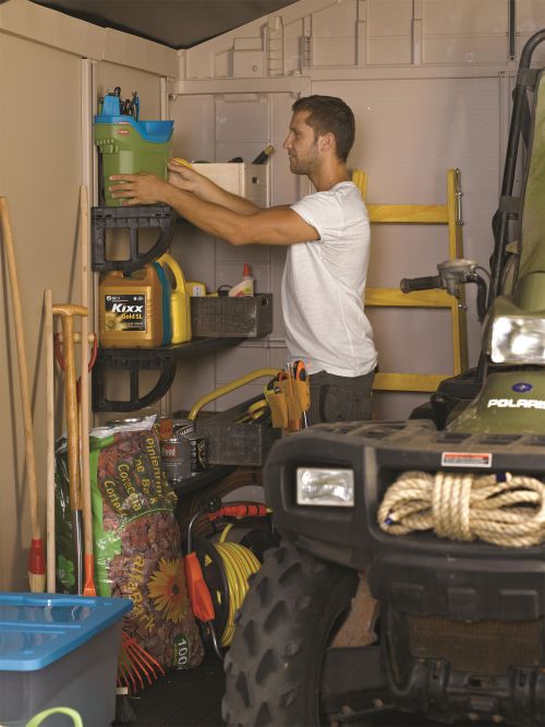 This shed is ventilated and comes with a window and skylight to allow plenty of natural light. The 8 x 11 has a heavy-duty floor - ideal for storing heavy items such as lawnmowers and ATVs, a high ceiling that lets you move around with ease, and wide double doors, making it easy to enter and access everything you need. This shed is lockable, includes two shelves, and is easy to assemble.