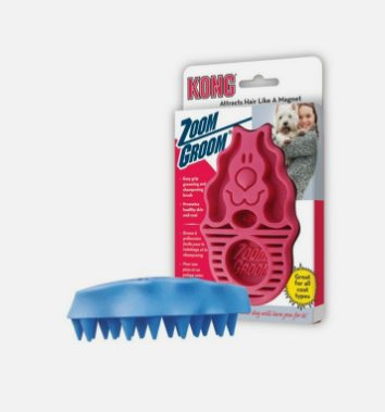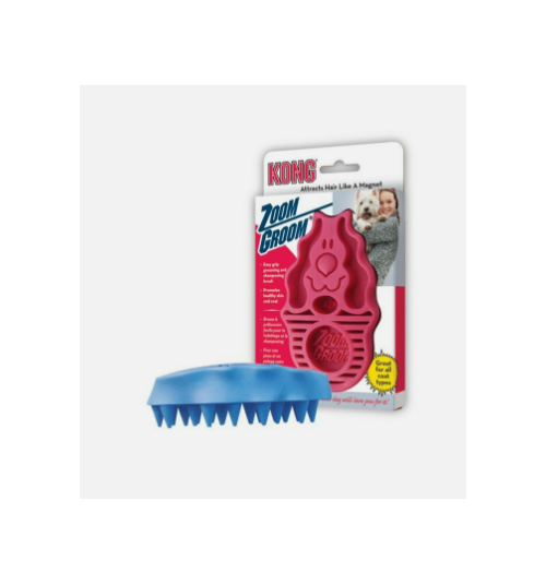 The KONG ZoomGroom helps make it easier to get your dogs clean. While shampooing use the ZoomGroom to clean your dogs' coat. The 3/4 inch rubber fingers reach through the coat to massage the skin, stimulating capillaries and natural oil production leading to a healthy coat for your dog.