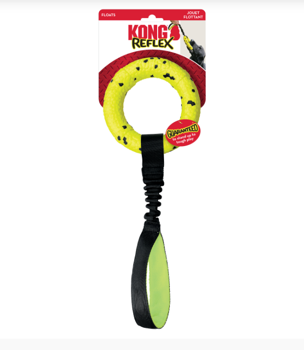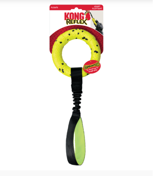 KONG Reflex Tug ring’s durable, flexible bounce comes from the same cutting-edge material as elite running shoe soles— so rugged it’s guaranteed to last through tough tugging and fetching. Bite-defying self-healing properties repair toothmarks for long-lasting, instinct-satisfying interactive fun with a stretchy strap for dynamic tugging. Floats for water play and stands up to the elements for seasons of action.