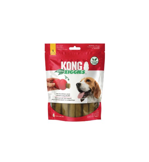 KONG Ziggies naturally delicious chews are specially designed and formulated to support dogs’ oral health. Firm texture and ridges effectively help push away plaque through the mechanical action of chewing, massage gums, and remove leftover food from dogs’ teeth, for fresh breath and bright smiles. With naturally delicious flavor dogs can’t resist, these chews are enriched with PhytoDent™ seaweed that’s packed with antioxidants, vitamins, minerals, and proteins. Plant-based and made without added wheat, corn, or soy, Ziggies are ideal as a treat or for stuffing inside a KONG Classic to extend daily dental care.