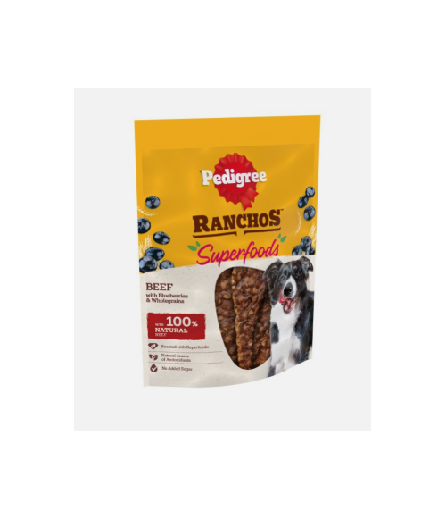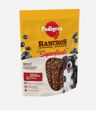 PEDIGREE RANCHOS SUPERFOODS, a boost of natural goodness for your adult dog. PEDIGREE SUPERFOODS dog treats are delicious and packed full of nutrient-rich superfoods for that ultimate boost of taste and enjoyment, with fruit to help support overall health.