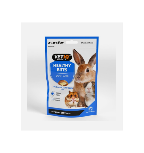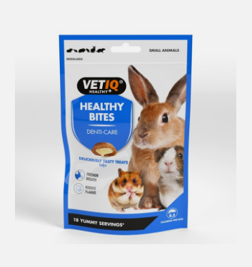 VETIQ Dental Care bites for small animals have been developed by our animal nutritionists to care for the dental health of your small pet. Comprising of a crispy cereal shell with a cream-filled centre which contains Eucalyptus oil & coconut oil to help fight the formation of plaque, Pomegranate to help control the build -up of tartar, Clove oil for fresh breath and vitamin C for maintaining healthy gums. Can help with bonding between pet and owner.
